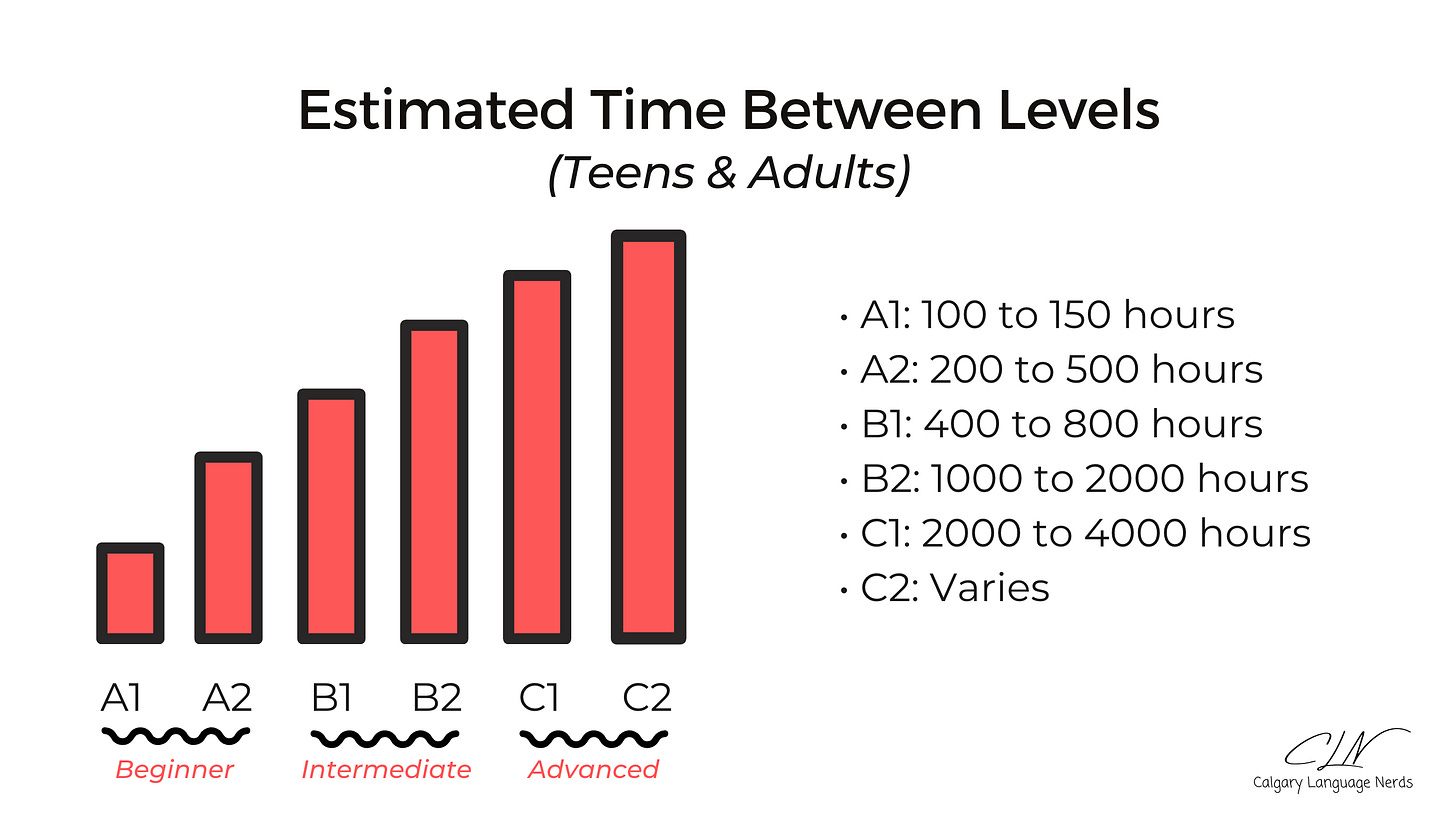 To demonstrate just how realistic this is (with a little discipline), take a look at the chart below. It outlines the approximate amount of time required to move between CEFR levels.