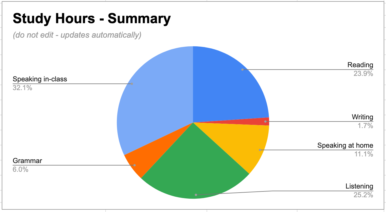 That graph is pretty interesting. I wonder if the picture looks the same for other levels. English is my second language and after graduating I never stopped to think about how much time I am or should be spending on what macro skill, now that I’ve reached C2 level and stopped taking classes. It makes me think whether I should replicate this somehow in my life, as a way to maintain my level or improve.