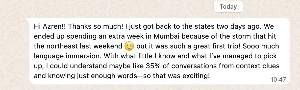That’s been the biggest thing that has surprised me in 2026. It’s just not that complex. I mean, check out this text from one of my students. She was a complete Gujarati beginner when I met her. She has had four lessons with me so far. Yes. Just four.